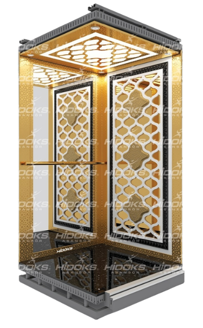 - A royal-inspired cabin featuring golden tones, intricate patterns, and illuminated decorative elements — ideal for luxury residential and high-end commercial projects.